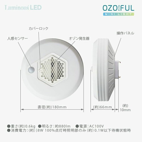 メーカー: ドウシシャ / DOSHISHA シリーズ名: オゾン発生器搭載小型ライト OZOFUL(オゾフル) ■電源:AC100V 50/60Hz ■定格消費電力: 約8W(照明のみ) 約2.2W(オゾン発生時) ■器具光束:880lm ■色温度:5000K ■外形寸法:(約)φ180mm×厚み66mm(引掛け刃は除く) ■本体質量:約0.6kg ※オゾン発生機能を使用する際は下記の内容を守って使用してください。